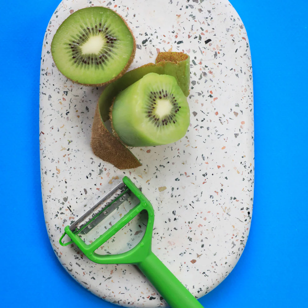 Переднее лезвие представляет собой микрозазубренное лезвие для очистки с долговечной и эффективной режущей кромкой для всех овощей с тонкой или гладкой кожицей (помидоры, сладкий перец, баклажаны и т. д.).