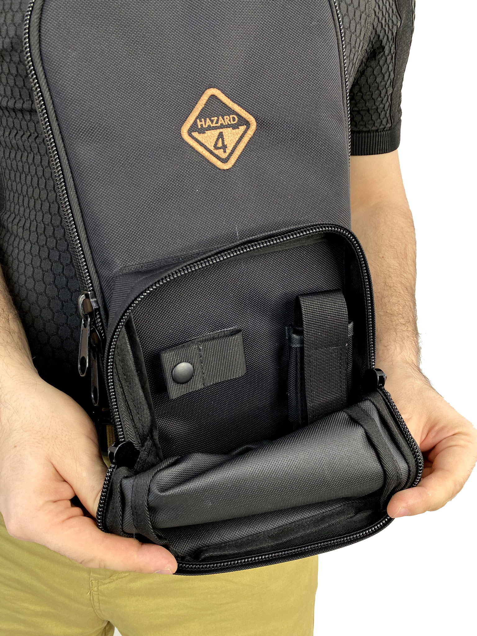 На внешней стороне чехла расположен карман на "молнии ", внутри которого 1 карман для ножа и хлясник с кнопкой, для крепления небольшого подсумка.